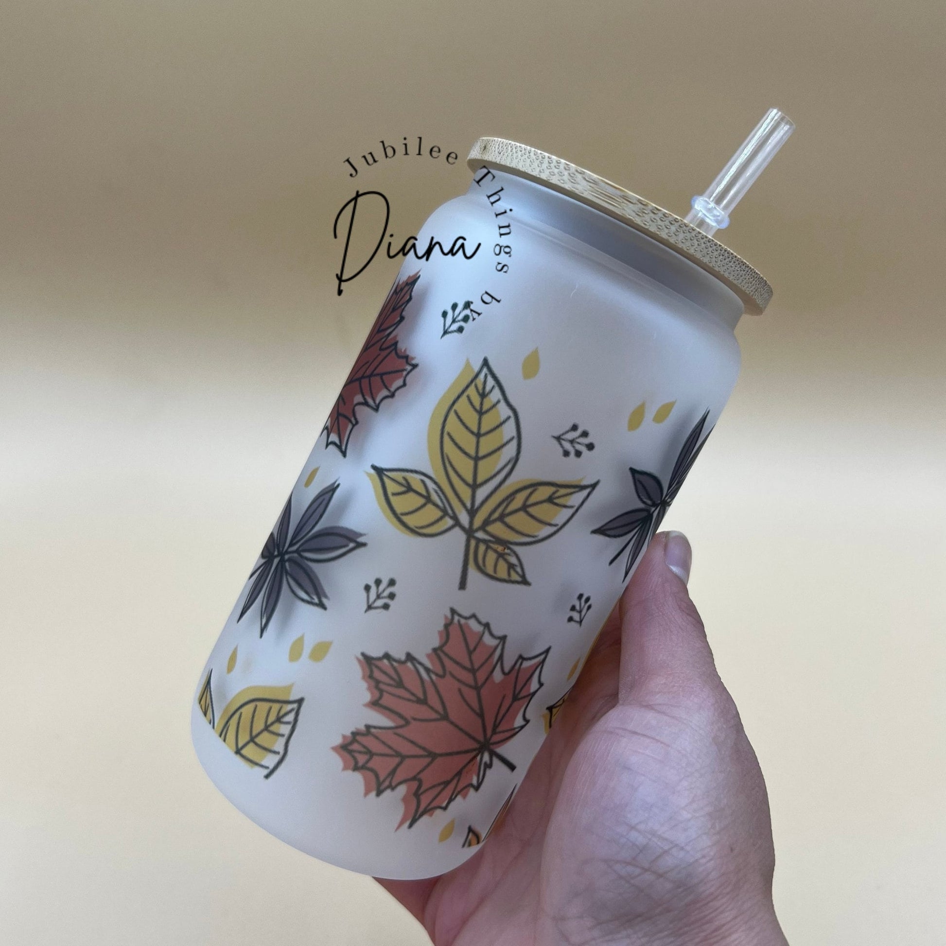 Fall Leaves on a frosted 16oz Libbey Glass beer can cup